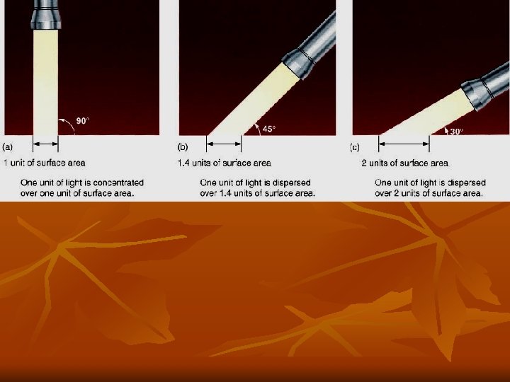 ANGLE of Insolation n n ANGLE of Insolation = the angle (above your horizon) that the Sun’s visible light rays strike Earth’s surface at a given location Higher angles of insolation (more direct rays) cause energy to be concentrated in a smaller area, allowing for more heating! Compare the two areas in terms of intensity (watts per square meter of surface area)!