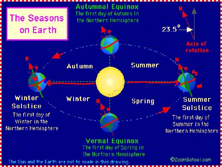 ANSWERS • 1. Name the four seasons. summer, autumn (fall), winter, spring • 2. Are the Earth's seasons caused by the differences in the distance from the Sun throughout the year or the tilt of the Earth's axis? The tilt of the Earth's axis • 3. What is the tilt of the Earth's axis (in degrees)? 23. 45 degrees • 4. During which season do the Sun's rays hit the Earth at the most direct angle? summer • 5. During which season are the days the shortest? winter • 6. What is the name of the shortest day of the year (and the beginning of winter)? winter solstice • 7. What is the name of the longest day of the year (and the beginning of summer)? summer solstice • 8. What is the name of a day in which the day and night are of equal duration? an equinox • 9. How many times each year do we have days in which the day and night are of equal duration? 2 times • 10. What are the names of each of these days? the vernal equinox and the autumnal equinox