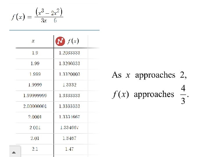 Estimating a Limit Numerically Filling in a table to help you explore a function’s behavior as x approaches some value is called numerical analysis. Use this method to find x F(x) 1. 75 1. 999 2 2. 001 2. 25 und 1. 001 1. 25