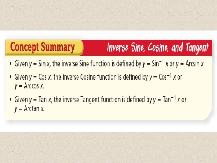 The inverse sine function is defined by y = arcsin x if and only if sin y = x. Angle whose sine is x The domain of y = arcsin x is [– 1, 1]. The range of y = arcsin x is [– /2 , /2]. Example: This is another way to write arcsin x.