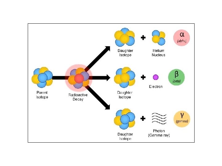 Radioactivity w sometimes results in the formation of new atoms w results from having an unstable nucleus w When these nuclei lose energy & break apart, radioactive decay occurs. § releases energy from the nucleus as radiation. § releases energy until they become stable, often as different atoms. § An element may have only certain isotopes that are radioactive. • These are called radioisotopes.