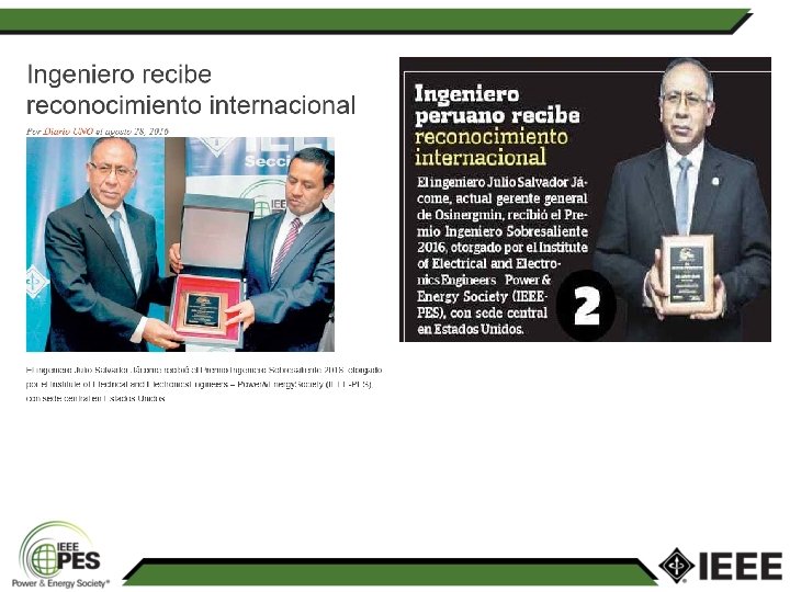 Plan de Trabajo 2. PES High Performing Chapter Program (HPCP) Con la finalidad de obtener este premio por alto rendimiento, se considerarán los criterios exigidos por la organización, para el presente año. 3. Distinción - Nominación al Ingeniero Sobresaliente PES El 08 de agosto del 2016 se realizó la ceremonia de premiación del Ingeniero Julio Salvador Jácome (Gerente General de Osinergmin Perú), como Ingeniero Sobresaliente PES IEEE, por su soporte al capítulo y su valiosa contribución al desarrollo de la regulación del mercado eléctrico peruano. En esta reunión organizada por la Sección Perú del PES IEEE, asistieron directivos de empresas, organismos y universidades relacionadas con el sector eléctrico peruano, a cual fue difundida por los medios periodísticos del país.