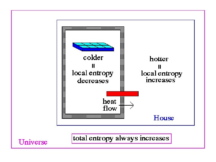 § i. e you can pump heat out of a refrigerator (to make ice cubes), but the heat is placed in the house and the entropy of the house increases, even though the local entropy of the ice cube tray decreases.