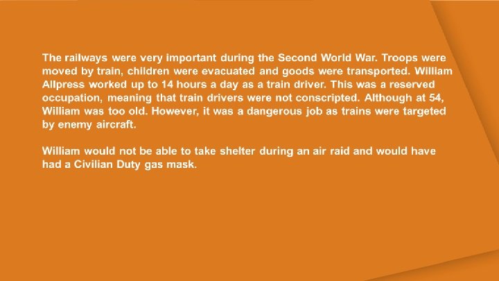 Railways Key Facts • • • William Allpress was a train driver for Southern Railways He was too old to fight in the Second World War Driving trains was a very important wartime job and he worked long hours
