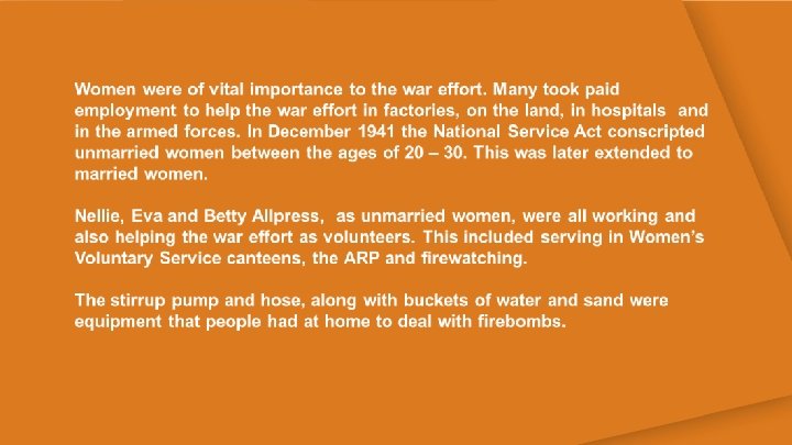 Women Helping the War Effort Nellie, Eva and Betty Allpress Key Facts • • • Nellie, Eva and Betty Allpress all had jobs. Eva worked in a clothes shop, Nellie worked in a bakery and Betty worked in a factory making seats for Lancaster bombers They also did voluntary (unpaid) war work They worked very long hours