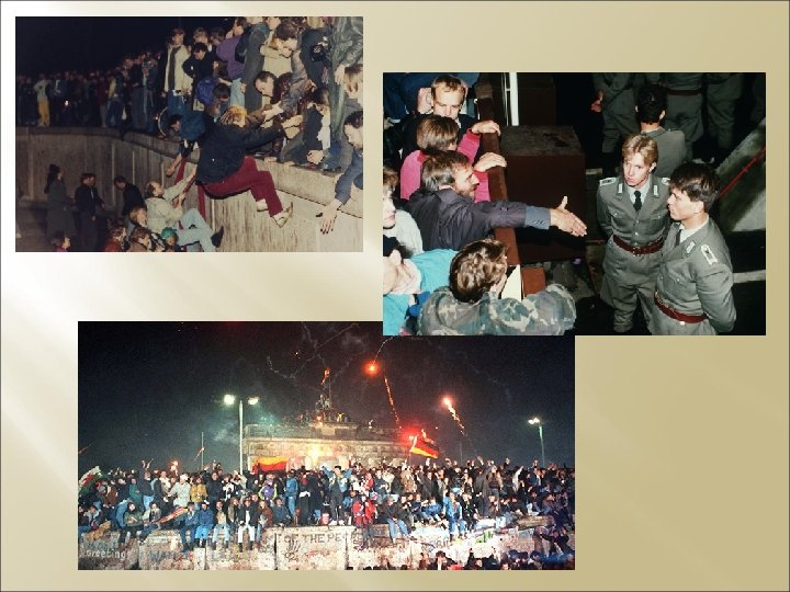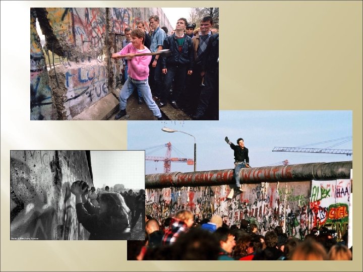Il muro di Berlino Ovest , nominalmente indipendente, è inserita all’interno della Germania dell’Est. Germania Ovest = NATO (1954) Germania Est = Patto di Varsavia (1955) ACCORDI = I tedeschi erano liberi di passare da una parte all’altra della città. Ma: tre milioni di persone fra il 1945 e il 1960 avevano lasciato Berlino Est. Nel 1961 il numero aumenta vertiginosamente. 1961 = Grave crisi internazionale. La Repubblica democratica chiude il confine. Notte tra il 12 e 13 agosto 1961: barriera di 40 Km di filo spinato, sorvegliata da 25. 000 uomini della polizia. Nei giorni seguenti: blocchi di cemento al posto del filo spinato. MURO di 155 Km Cadrà nel 1989 (dopo 28 anni).