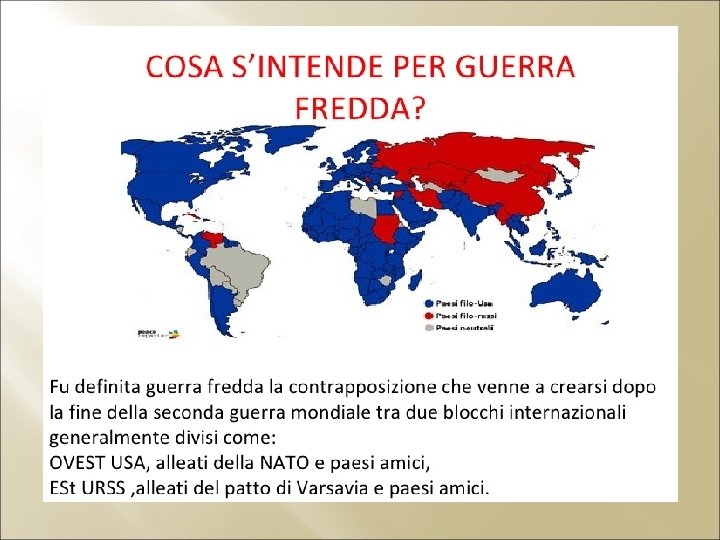 1949 Patto atlantico Stati Uniti, Canada, Europa occidentale (inizialmente 12 nazioni). Alleanza decisa durante il blocco di Berlino. 1949 NATO - North Atlantic Treaty Organization In seguito aderiscono anche altre nazioni, oggi 29 (Turchia 1952). Organizzazione militare difensiva: intervento contro l’URSS in caso di attacco ad uno solo dei paesi membri. 1955 PATTO DI VARSAVIA URSS e paesi del blocco sovietico. Nata come contrapposizione all'Alleanza del Patto Atlantico. La costituzione avviene nella settimana successiva all’ingresso ufficiale della Germania ovest nella NATO. Corsa agli armamenti nucleari. Bomba atomica messa a punto dall’URSS nel 1949. Ufficialmente sciolto nel 1991, dopo il crollo del comunismo. Prima bomba H USA 1952 – Prima bomba H URSS 1953