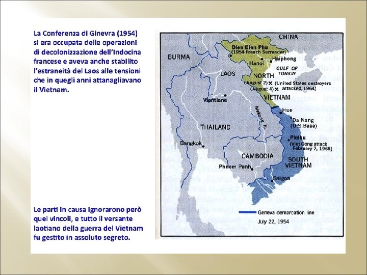 La guerra del Vietnam (USA 1962 -73) La guerra del Vietnam fu un conflitto armato combattuto a partire dal 1955 (data di costituzione del Fronte di Liberazione Nazionale filo-comunista), filo-comunista e conclusosi il 30 aprile 1975. La guerra si svolse prevalentemente nel territorio del Vietnam del Sud. Vide contrapposte le forze insurrezionali filo-comuniste, sorte in opposizione al governo autoritario filo-statunitense costituito nel Vietnam del Sud, e le forze governative del Vietnam, creato dopo la conferenza di Ginevra del 1954, che aveva previsto una consultazione popolare per la riunificazione del paese (non gradita agli USA). Il conflitto, iniziato in realtà fin dalla metà degli anni Cinquanta con il primo manifestarsi di un'attività terroristica e di guerriglia in opposizione al governo sudvietnamita, vide il diretto coinvolgimento degli USA nel 1962 che incrementarono progressivamente le loro forze militari in aiuto al governo del Vietnam del Sud, fino a impegnare un'enorme quantità di forze terrestri, aeree e navali dal 1965 al 1972, con un picco di 550. 000 soldati nel 1969. Il governo USA non riuscì, nonostante questo spiegamento di forze, a conseguire la vittoria politico-militare, ma subì al contrario pesanti perdite, finendo per abbandonare nel 1973 il governo del Vietnam del Sud.