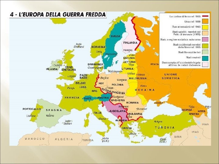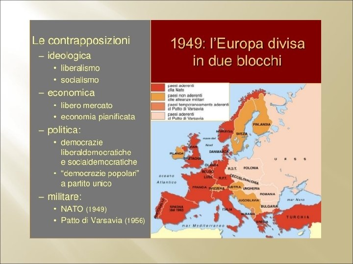 1948 -1949 1946: Divisione Europa in DUE BLOCCHI CONTRAPPOSTI. EST = Governi di tipo socialista, influenza diretta URSS (stati satelliti, partito unico). OVEST = Governi di tipo democratico, liberalismo, influenza indiretta USA. L’URSS acquisisce in maniera DIRETTA Estonia, Lettonia, Lituania, inoltre territori al confine con Finlandia, Germania, Cecoslovacchia, Romania e Polonia. EUROPA DELL’EST: DELL’EST Germania Est, Polonia, Ungheria, Romania, Bulgaria, Cecoslovacchia, Albania, Jugoslavia (Tito). NO: Grecia, Bosforo e Dardanelli. EUROPA DELL’OVEST: DELL’OVEST Allontanamento dei partiti comunisti dal governo. Anticomunismo; Anticomunismo ossessione per l’infiltrazione di elementi comunisti; intolleranza politica. “Commissione per le attività antiamericane”: senatore Joseph Mc. Carthy (maccartismo = Movimento di avversione al comunismo e in genere alle correnti di sinistra, ispirato, nelle sue manifestazioni più estremiste, non solo a motivi ideologici ma anche a esagerate reazioni psicologiche).