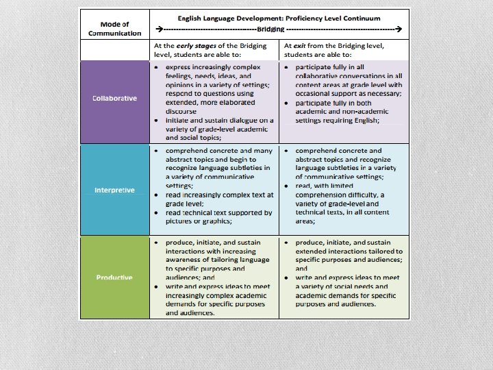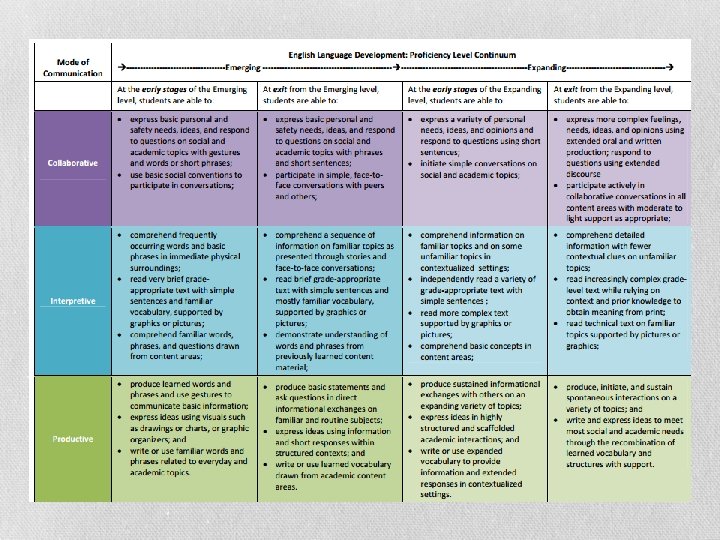 Proficiency Level Descriptors Include: • Overall Proficiency (entry & exit) • Extent of linguistic support needed • Describe knowledge, skills, and abilities across a continuum • Three levels: Emerging, Expanding, Bridging at early and exit stages • Guide targeted instruction in ELD and differentiated instruction in content areas