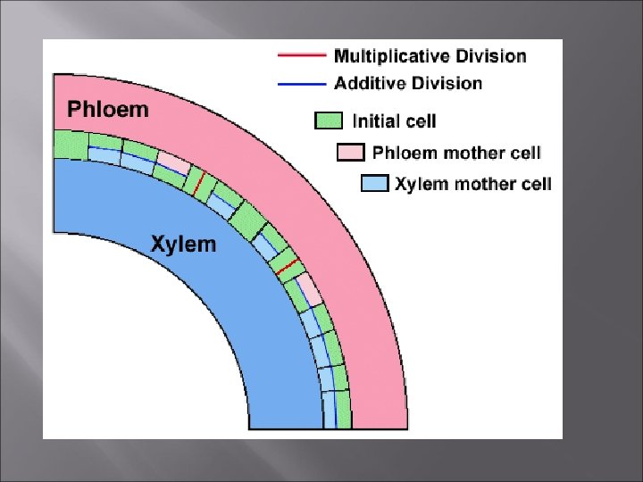 Secondary Phloem- Created by the vascular cambium. Pushed toward the outside of the stem Secondary Xylem- Created by the Vascular cambium. Pushed toward the insided of the stem Multiplicative division allows for continuous band around the stem. Additive division makes the stem thicker.