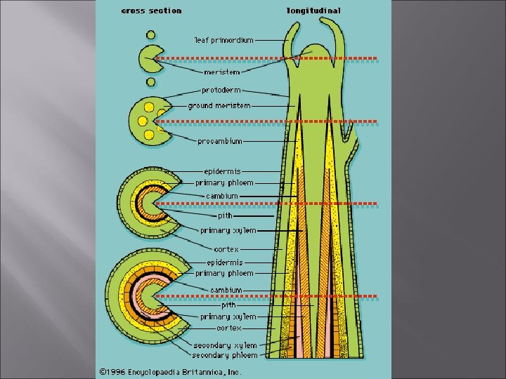 VASCULAR CAMBIUM Meristem cells that produce secondary growth Divides longitudinally (anticlinal walls) Gives rise to secondary growth Secondary xylem—pushed toward the inside of the plant Secondary phloem—pushed to the outside of the plant Fusiform initials produce vessel elements and phloem Ray initials produce short cells used for storage