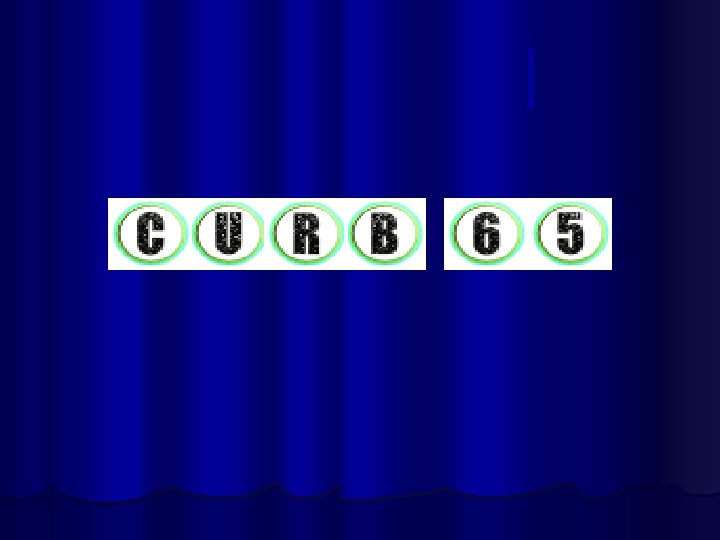l l l l Confusion Urea level (>19 mmol/L) Respiratory rate (>30 b/m) Blood Pressure SBP<90 mm. Hg or DBP <60 mm. Hg Age >65 yrs Excellent indicator for mortality