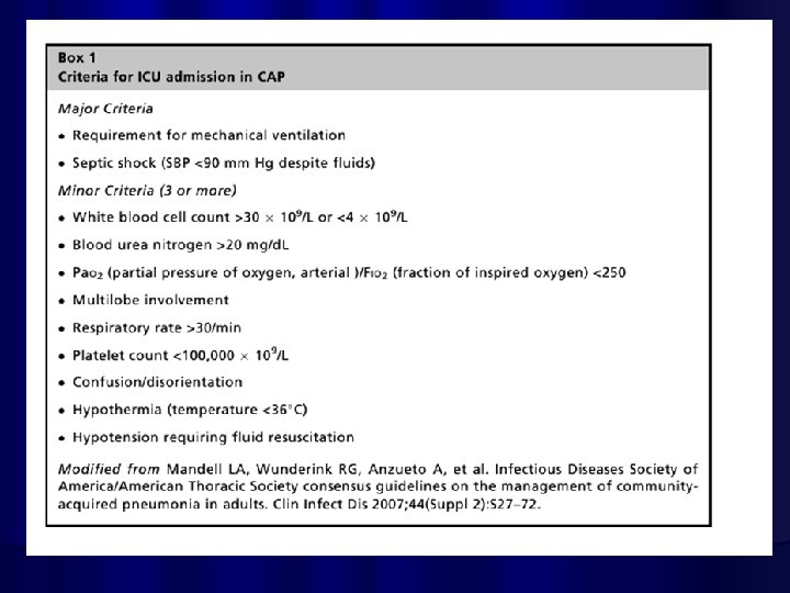 When to admit ? Age > 65 y l Comorbid condition l Abnormal vital signs l RR >30 l BP < 90/60 l Temp > 101 l Altered mental status l Sepsis/ multiorgan dysfunction l Abnormal Lab findings l TLC < 4000 or > 30000 l Po 2 , 60 PCO 2 > 50 l Multi-lobe involvement or pleural effusion l
