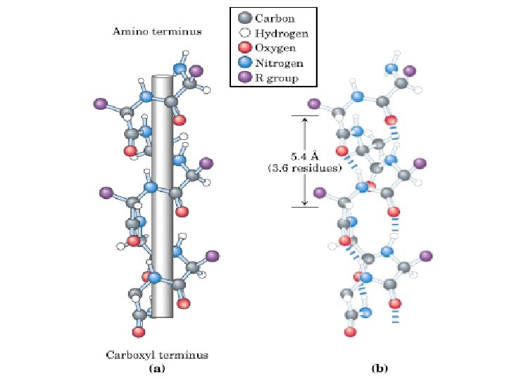 Helical Structures With the information already obtained such as ; The rigid and planer nature of peptide bond, Allowed conformations using torsion angles and X-ray result of keratin protein obtained by Willium Astbury, who observed that a regular structure was occurring in keratin that reapeated everu 5. 15 to 5. 2 Ao. Pauling and Corey proposed the helical conformation which they called a helix. In this structure the polypeptide backbone is is tightly wound around an imaginary axis. The side chain R groups of AA residues protrude outward from the helical backbone. The repeating unit is a turn of helix (3. 6 amino acids) with the periodicity of 5. 4 Ao