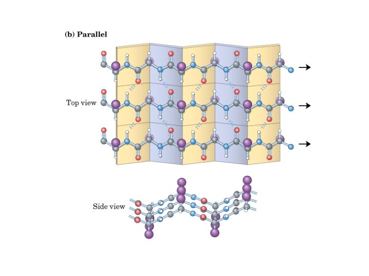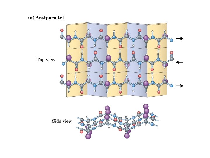 Parallel b-conformation: with adjacent polypeptide chains Having same amino to carboxy terminus orientation. Anti-parallel b-conformation: with adjacent polypeptide chains having opposite amino to carboxy terminus orientation. When two or more beta sheets are layered closely together within a Protein the R groups of amino acid residues on touching surfaces must be small for example silk fibroin or spider web fibroin which Have beta sheet structure have very high content of Gly and Ala.