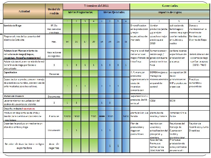 v. Actividades Trimestrales Planificadas en el POA 2011 �Riego ∕ goteo a cultivos de los usuarios del sistema (111 - 129). �Asistencia Técnica en el Manejo de la Red extra finca (9 km) �Capacitación a productores en el manejo de prácticas culturales �Levatamiento y Actualización del Padrón de Usuarios q Otras Actividades de Importancia �Producción de Plantulas de Sandia, Tomate y Chile Dulce.