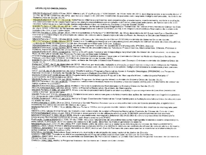 Oncologia Portaria n° 3388, de 30 de dezembro de 2013: Redefine a Qualificação Nacional em Citopatologia na prevenção do câncer do colo do útero (Quali. Cito), no âmbito da Rede de Atenção à Saúde das Pessoas com Doenças Crônicas. Portaria n° 189, de 31 de janeiro de 2014: Institui o Serviço de Referência para Diagnóstico e Tratamento de Lesões Precursoras do Câncer do Colo de Útero (SRC), o Serviço de Referência para Diagnóstico de Câncer de Mama (SDM) e os respectivos incentivos financeiros de custeio e de investimento para a sua implantação. Portaria n° 140, de 27 de fevereiro de 2014: redefine os critérios e parâmetros para organização, planejamento, monitoramento, controle e avaliação dos estabelecimentos de saúde habilitados na atenção especializada em oncologia e define as condições estruturais, de funcionamento e de recursos humanos para a habilitação destes estabelecimentos no âmbito do Sistema Único de Saúde (SUS).