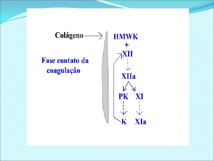 Via intrinseca Fator XII se liga a fibrila de colágeno sub endotelial, que fica exposta após lesão do vaso sanguíneo Ao unir-se à fibrila de colágeno→formação de complexo com o cininogênio de alto peso molecular (HMWK) e com a pré-calicreína (PK)→ ativando o fator XII→FXIIa ativa o fator XI, que por sua vez ativa outros fatores de coagulação FXIa também ativa a pré-calicreína e a transforma em calicreína→ acelera a ativação do FXII