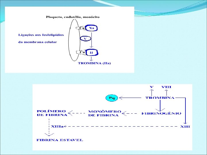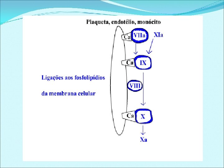 Via comum Ponto de convergência das duas vias FVIIa → via extrínseca FXIa → via intrínseca ativação dos fatores IX e X com a participação do fator VIII Formação de complexo onde os FIX e FX estão ligados pelo cálcio a fofolipídeos de membrana celular FXa - consequência das duas vias que iniciam a coagulação Geração da trombina→ agente principal da coagulação