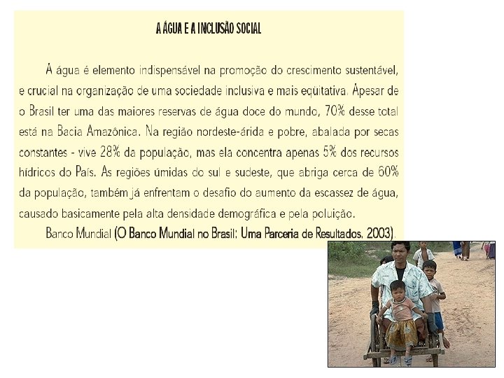 Vazões média de água por habitantes no Brasil Classe de vazão média por habitante por ano (ONU): • < 500 m³/hab. /ano – situação de escassez; • 500 a 1. 700 m³/hab. /ano – situação de estresse; e • > 1. 700 m³/hab. /ano – situação confortável. Fonte: ANA 2005