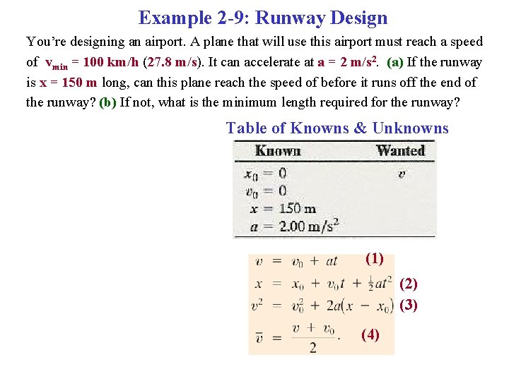 Example 2 -9: Runway Design You’re designing an airport. A plane that will use this airport must reach a speed of vmin = 100 km/h (27. 8 m/s). It can accelerate at a = 2 m/s 2. (a) If the runway is x = 150 m long, can this plane reach the speed of before it runs off the end of the runway? (b) If not, what is the minimum length required for the runway? Table of Knowns & Unknowns (1) (2) (3) (4)