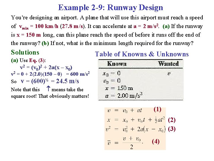 Example 2 -9: Runway Design You’re designing an airport. A plane that will use this airport must reach a speed of vmin = 100 km/h (27. 8 m/s). It can accelerate at a = 2 m/s 2. (a) If the runway is x = 150 m long, can this plane reach the speed of before it runs off the end of the runway? (b) If not, what is the minimum length required for the runway? Solutions (a) Use Eq. (3): v 2 = (v 0)2 + 2 a(x – x 0) Table of Knowns & Unknowns v 2 = 0 + 2(2. 0)(150 – 0) = 600 m/s 2 So v = (600)½ = 24. 5 m/s Note that this means take the square root! That obviously matters! (1) (2) (3) (4)