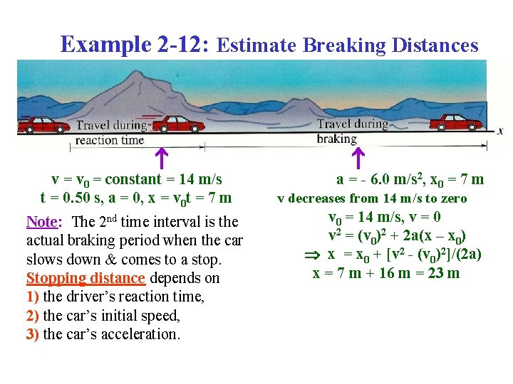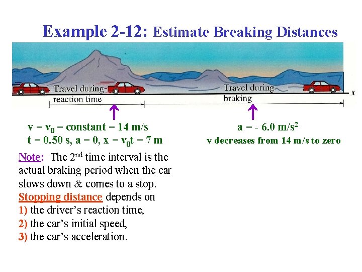 Example 2 -12: Estimate Breaking Distances v = v 0 = constant = 14 m/s t = 0. 50 s, a = 0 Note: The 2 nd time interval is the actual braking period when the car slows down & comes to a stop. Stopping distance depends on 1) the driver’s reaction time, 2) the car’s initial speed, 3) the car’s acceleration. a = - 6. 0 m/s 2 v decreases from 14 m/s to zero