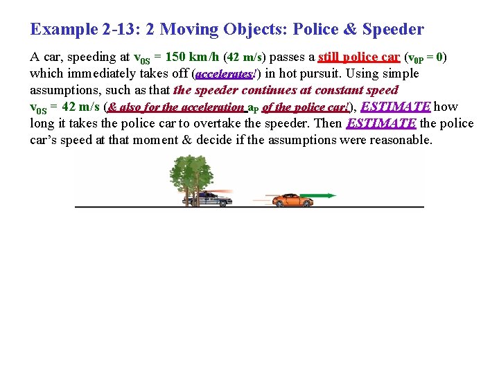 Example 2 -13: 2 Moving Objects: Police & Speeder A car, speeding at v 0 S = 150 km/h (42 m/s) passes a still police car (v 0 P = 0) which immediately takes off (accelerates!) in hot pursuit. Using simple assumptions, such as that the speeder continues at constant speed v 0 S = 42 m/s (& also for the acceleration a. P of the police car!), ESTIMATE how long it takes the police car to overtake the speeder. Then ESTIMATE the police car’s speed at that moment & decide if the assumptions were reasonable.
