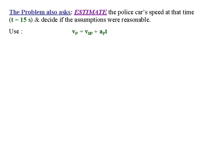 The Problem also asks: ESTIMATE the police car’s speed at that time (t = 15 s) & decide if the assumptions were reasonable. Use : v. P = v 0 P + a. Pt