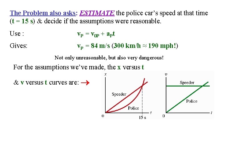 The Problem also asks: ESTIMATE the police car’s speed at that time (t = 15 s) & decide if the assumptions were reasonable. Use : v. P = v 0 P + a. Pt Gives: v. P = 84 m/s (300 km/h ≈ 190 mph!) Not only unreasonable, but also very dangerous! For the assumptions we’ve made, the x versus t & v versus t curves are: