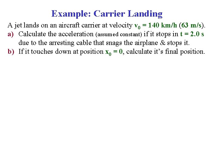 Example: Carrier Landing A jet lands on an aircraft carrier at velocity v 0 = 140 km/h (63 m/s). a) Calculate the acceleration (assumed constant) if it stops in t = 2. 0 s due to the arresting cable that snags the airplane & stops it. b) If it touches down at position x 0 = 0, calculate it’s final position. Solutions a) v 0 = 63 m/s, t = 2. 0 s = time to stop. When it is stopped, v = 0. So, use v = v 0 + at = 0, which gives a = - (v 0/t) = - (63/2) = -31. 5 m/s 2 b) Use x = x 0 + v 0 t + (½)at 2 , which gives x = x 0 + v 0 t + (½)at 2 = 0 + (63)(2) + (½)(-31. 5)(2)2 x = 63 m