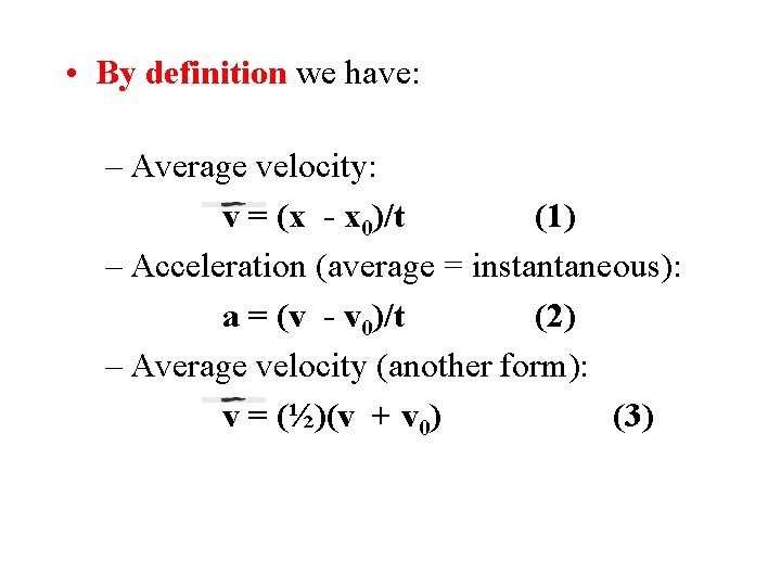 • By definition we have: – Average velocity: v = (x - x 0)/t (1) – Acceleration (average = instantaneous): a = (v - v 0)/t (2) – Average velocity (another form): v = (½)(v + v 0) (3)