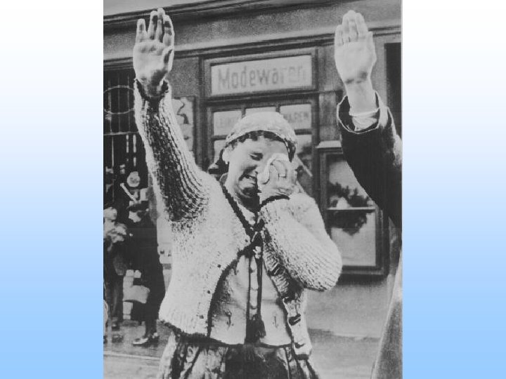 Mein Kampf • German blood must be protected. • Jewish people are “Untermenchen” or “Under people”. • Their control of Germany and the world at the end of World War One led to Germany being sold out to the Allies. • Jews along with Slavic peoples of Eastern Europe, Gypsies (SE Europeans), homosexuals, disabled people, and mentally challenged people should all be removed from contaminating German Blood.