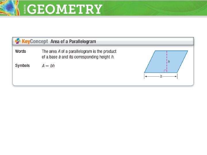 Perimeter and Area of a Parallelogram 256 = b 2 Subtract 144 from each side. 16 = b Take the positive square root of each side. The height is 16 in. UT is the base, which measures 32 in. A = bh = (32)(16) or 512 in 2 Area of parallelogram b = 32 and h = 16 Answer: The perimeter is 104 in. and the area is 512 in 2.