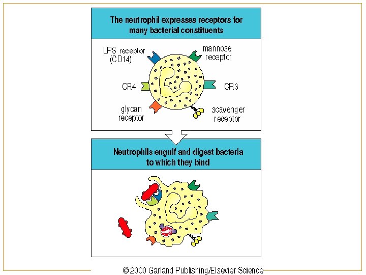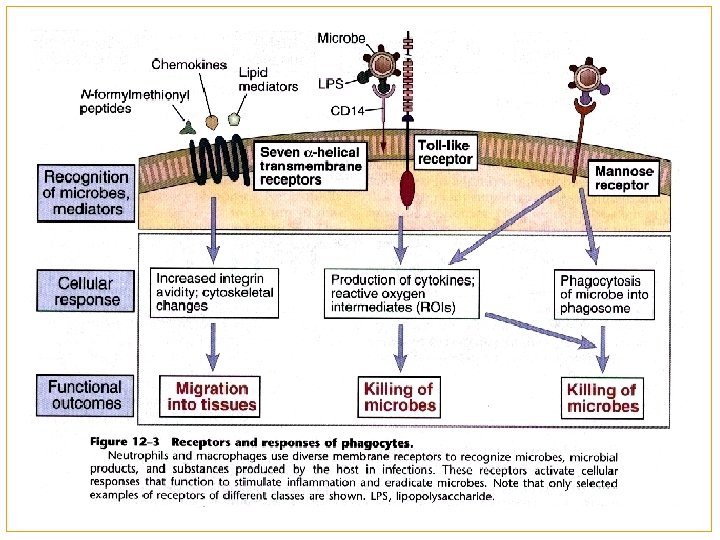 Macrophages phagocytose and degrade foreign particles, bacteria and dead (and dying) host cells. Receptors on Macrophages: Fcγ receptors Complement receptors IFN-g receptor Chemokine receptors Mannose receptor Toll-like receptors(TLRs) Scavenger receptors(SRs) LPS receptor(CD 14)