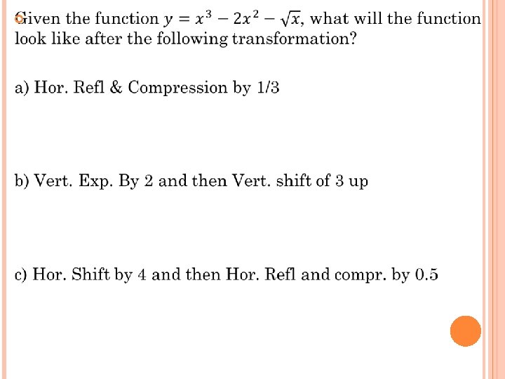 Ex: Given that the coordinates (2 d, 3 e) is on the original function, which of the following will be the coordinates after the transformation: V. C. by a factor of 2/3 H. C. by a factor of 1/3 H. S. 3 units right V. S. 6 units up © Copyright All Rights Reserved Homework Depot www. BCMath. ca