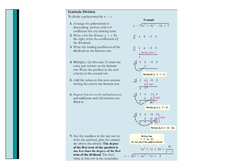 Comparison of Long Division and Synthetic Division of X 3 +4 x 2 -5 x+5 divided by x-3