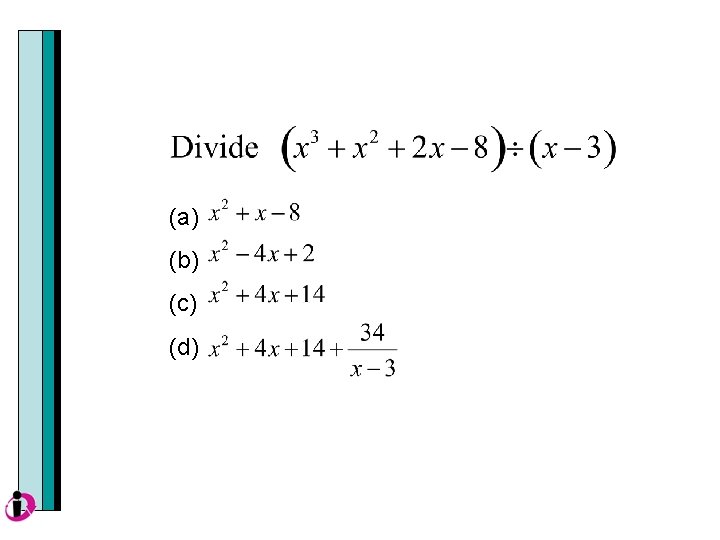 Using synthetic division instead of long division. Notice that the divisor has to be a binomial of degree 1 with no coefficients. Thus: