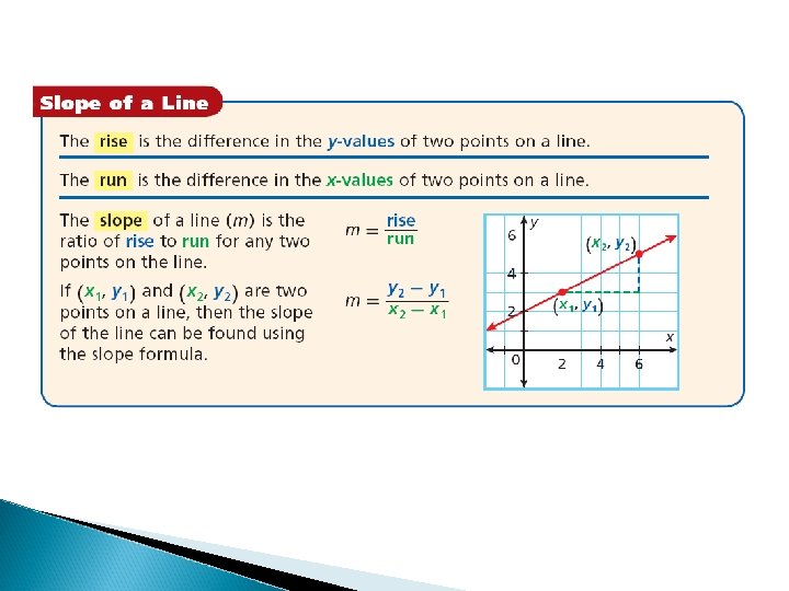 Example 6 - Find the slope of the line that contains (– 2, – 2) and (7, – 2). Substitute (– 2, – 2) for (x 1, y 1) and (7, – 2) for (x 2, y 2).