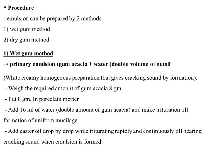 * Emulsion: - it is preparation of 2 immiscible liquid. One of them is broken into minute globules each surrounded by thin film of emulsifying agent. - this emulation is prepared to obscure and avoid : * un palatability of the drug. * greasy character of the oil - The emulsion may be used * externally ( red label ) * internally ( white label ) Ex : - * Caster oil emulsion * cod liver oil emulsion