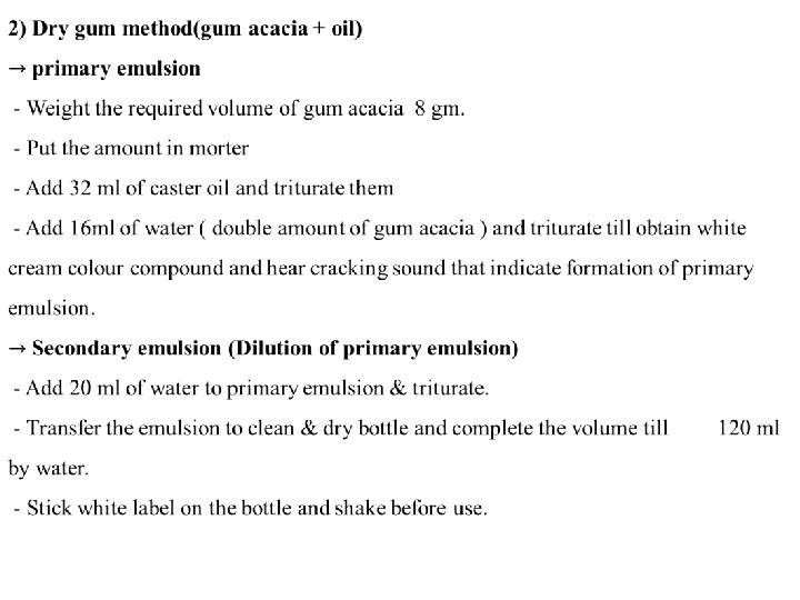 Castor oil emulsion -prepare the following prescription R/ castor oil 16 ml gum acacia 4 gm. water up to 60 ml m. ft emulsion send 120 ml sig. one cup full when required