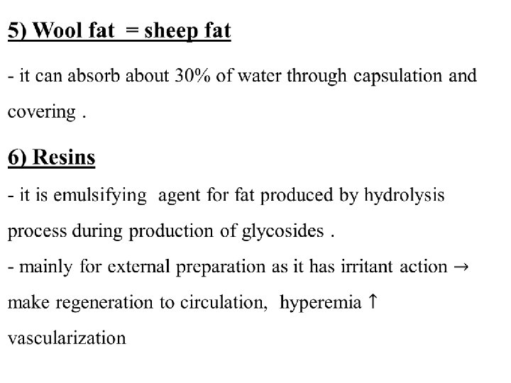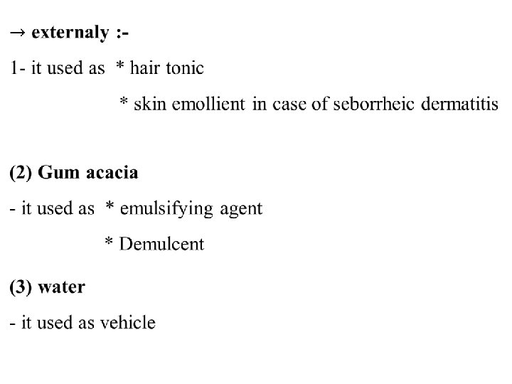 3) saponin - it is emulsifying agent for both fixed and volatile oil - for external use only as it is irritant to the bowl when taken orally. - it make frothy blot. 4) soft soap or potassium hydroxide - it is emulsifying agent for both fixed and volatile oils. - for internal use only as purgative - it has counter irritant action used in treatment of *sprain *bruise