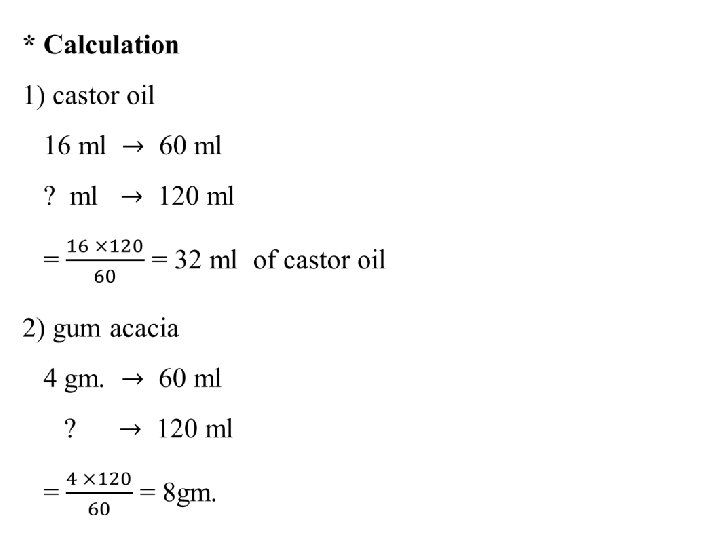 * Prescription after calculation R/ castor oil 32 ml Gum acacia 8 gm. water up to 120 ml m. ft emulsion sig. One cup full when required