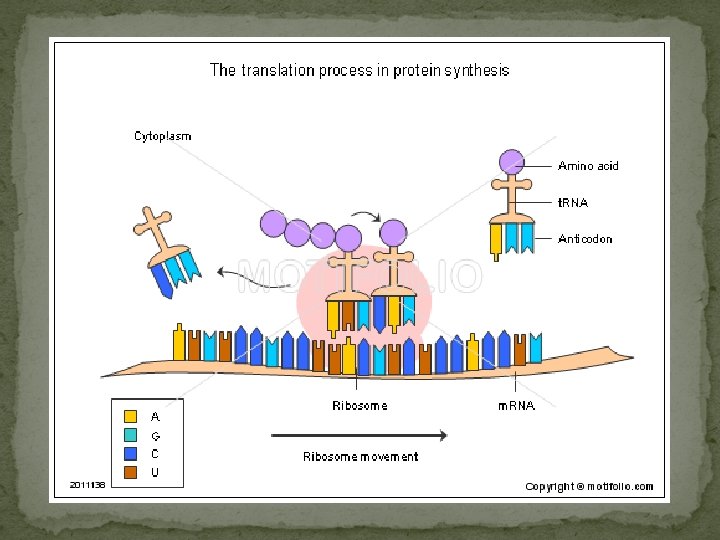 Reading The Genetic Code �Codons must be read in the correct order �A start codon (AUG) begins the reading �Then the codon is read, without spaces, three nucleotides at a time � DO NOT OVERLAP �Stop codon stops the reading process �This is called the reading frame �If the reading frame is changed, then translation produces a different protein �Any adjustment to this code will change the protein