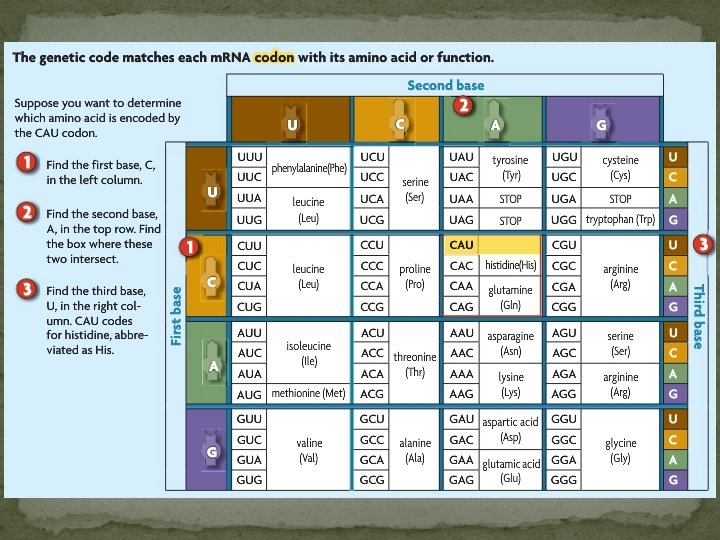 Codons �Codon is three letters of RNA code �Each three letters codes for one amino acid �More than one codon can code for an amino acid � Generally share the same first two nucleotides