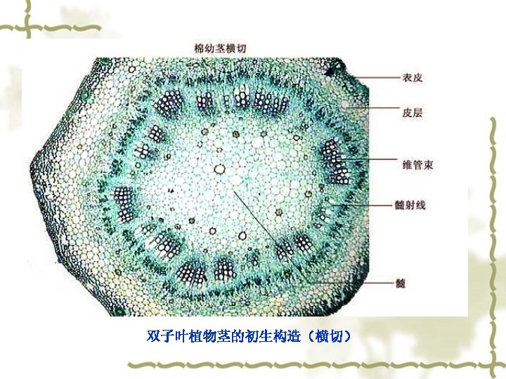 v ②Primary v v v Structure of Dicot Stems epidermis(trichome and stoma) cortex vascular cylinder Definition : v endarch: v The order of differentiation and maturation of primary xylem of stem is from the inside to outside, and is known as endarch.