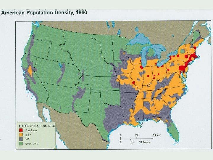 North - smaller farms, fewer labor-intensive crops, less demand for slavery, more cities and industries South – large farms and plantations growing cotton and tobacco, made profitable by the use of slave labor