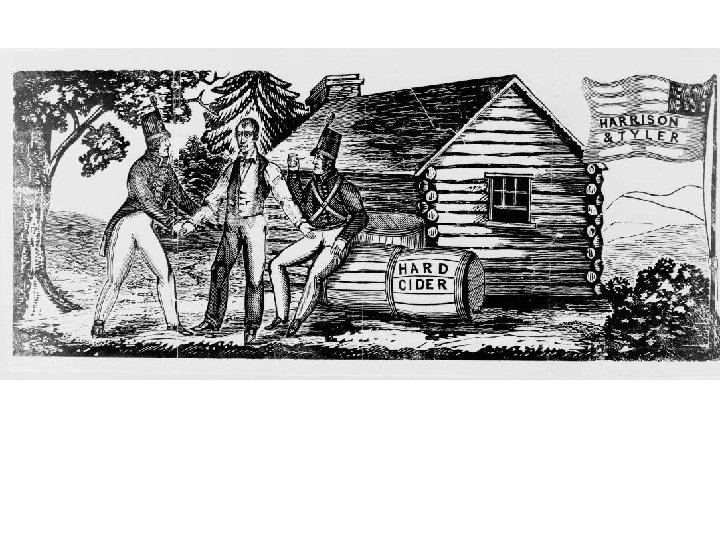 • Political Parties – “New” Democrat”: western farmers and eastern “ mechanics” or workingmen. The poor as opposed to the elites – A second party system: democrats v. whigs! • Campaigning pitched to the common man – hard cider, beer and barbecue! • campaign issues : sensation and log cabins. – Adams characterized as a pimp, condemned for bringing gaming tables into the white house. – Jackson’s wife! – Log cabins of Harrison ( Webster apologized for not being born in a log cabin)