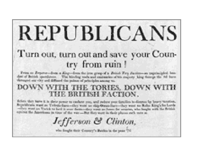 • Federalists argued, a vote for Republicans was “for the tempestuous sea of anarchy and misrule” • Jefferson seen incorrectly as an atheist • Democratic Republicans argued, the vote was for “peace or war, happiness or misery”